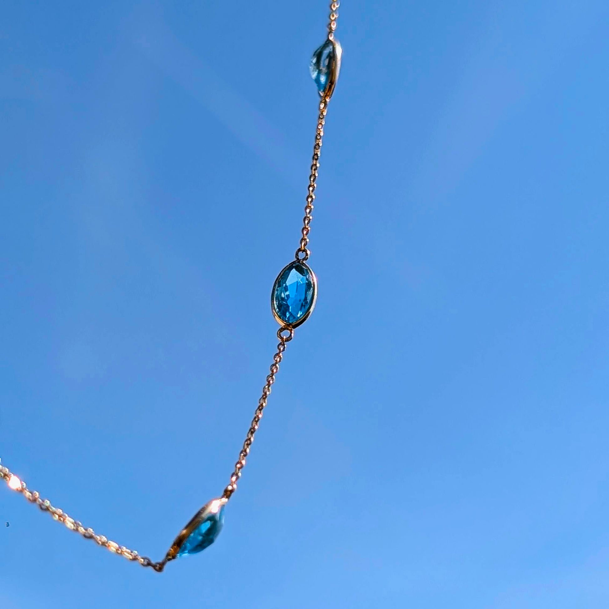 Crafted in 14K gold, this necklace features a rhythmic sequence of marquise-cut blue topaz stones arranged around the chain in elegant gaps. Each stone is of exceptional clarity and brilliance, carefully cut to catch the light from every angle. The result is a luminous collar of colour—intense yet refined—that transitions effortlessly from day to night.