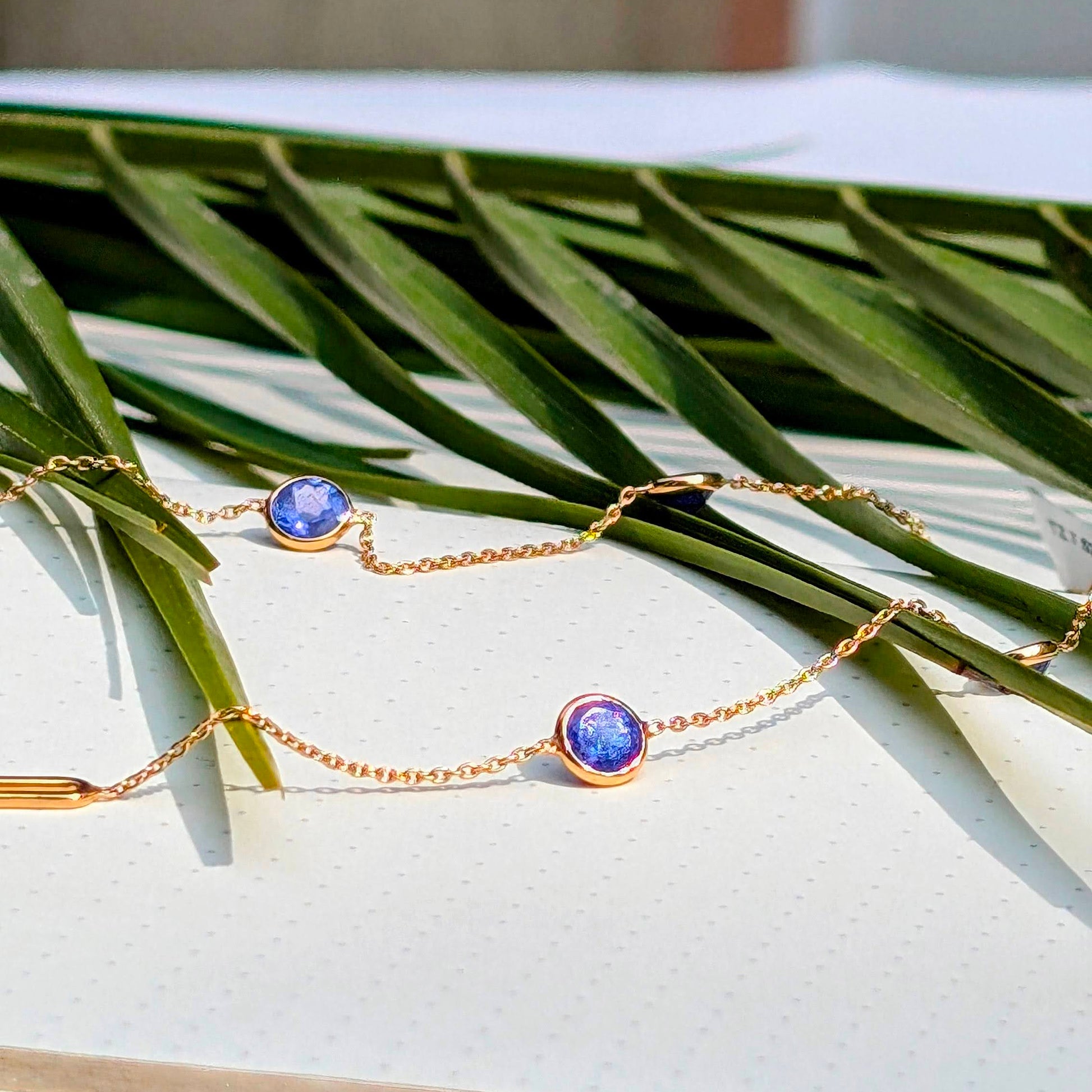 Crafted in solid 18K gold, this necklace celebrates the beauty of tanzanite through a composition of different cuts and shapes. Each stone—carefully chosen for its vivid violet-blue hue and brilliance—is placed along the chain in a rhythm that feels organic yet refined. The varying silhouettes add intrigue and dimension, allowing the necklace to shimmer from every angle.